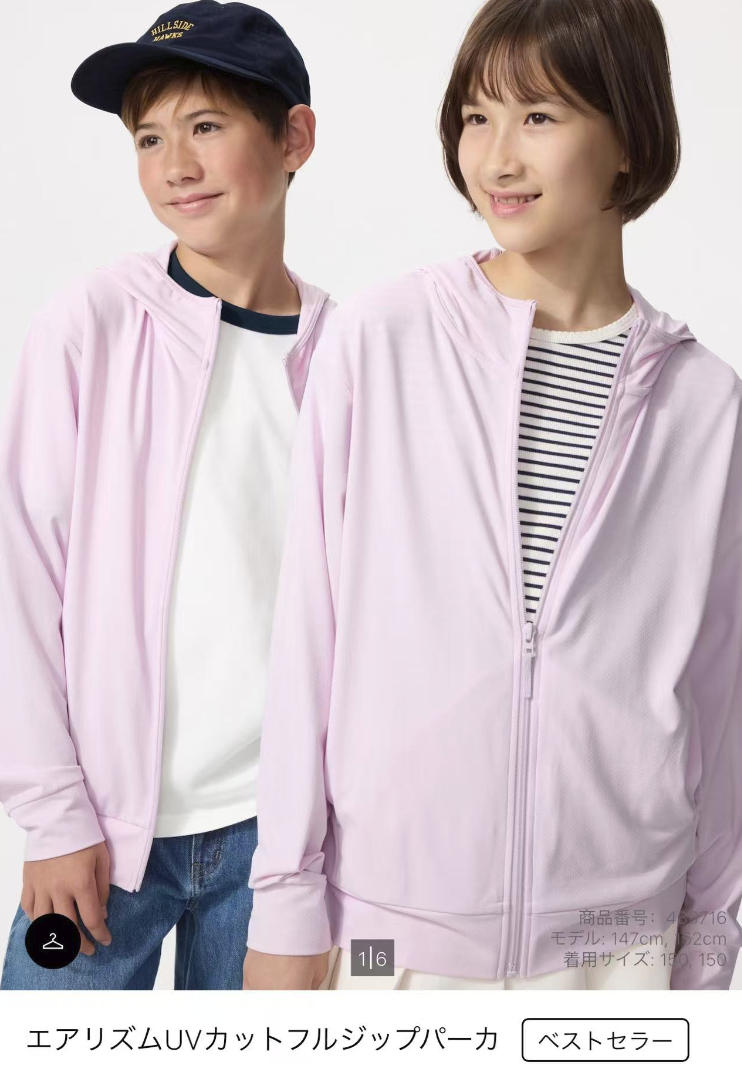 优衣库 AIRism儿童防紫外线拉链连帽开衫防晒外套 多色多尺码可选(483716)(缺货退款)